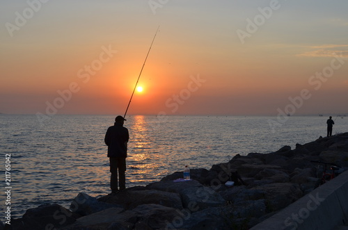 sunset, fishing, sea, fisherman, water, beach, silhouette, sun, sky, fish, ocean, rod, sunrise, lake, nature, dusk, evening, boat, sport, cloud, angler, people, landscape, night, coast