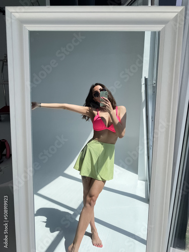 Fit tanned woman in light green beach skirt, sunglasses, bright pink swimsuit bra, summer fashion stylish wear, take photo selfie on phone in mirror for social media, stories, vertical.