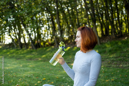 fit woman in sport clothes drinking water while working out, doing yoga on park in autumn sunny day
