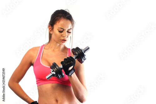 bicep, gym, dumbbell, woman, exercise, arm, working out, perspiring, glove, training, muscle, weightlift, flexing, weight, fit, bodybuilding, figure, girl, health, strength, strong, sport, loss, body, energy, fitness, power, shape, top, white, isolated on white