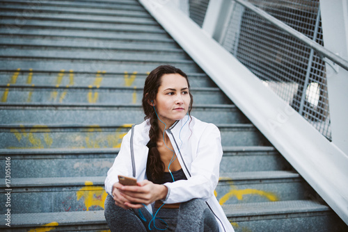 copy space, young, work out, woman, waterfront, urban, tough, strong, stair, sitting, phone, music, morning, metal, earphones, gritty, fit, female, evening, dusk, device, dawn, cool down, city, brunette, attractive, athletic, mixed race, girl, person, people, adult, adult, 20s, grown-up