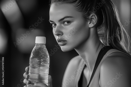 Fit Young Woman in Activewear with Sleek Ponytail Holding Hydration Bottle Inside Gym Environment Featuring Blurred Fitness Machines.