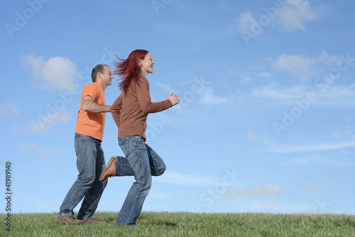 couple, couple, man, woman, girl, run, jog, recreation, recreation, move, fitness, sport, athletic, gambol, jump, race, healthy, health, fit, lively, lively, high spirits, vigorous, agile, active, activity, energy, fun, fun, happy, merry, outdoors, outside, meadow, grass, nature, heaven, european