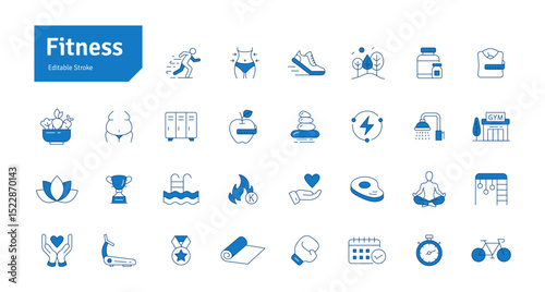 Fitness Blue Line Icons Set. Health, Healthy Lifestyle, Wellbeing, Exercise, Health Care, Sport, Workout Editable Stroke Vector Illustration