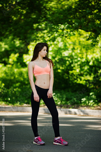Fitness sport girl in sportswear posed at road in park, outdoor sports, urban style.