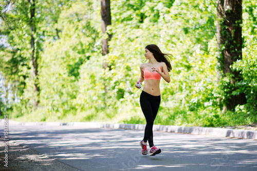 Fitness sport girl in sportswear run at road in forest with bottle water on hand, outdoor sports, urban style.