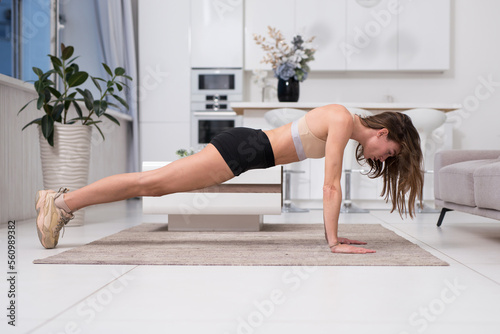fit, physical exercise, home, exercise, fitness, press-ups, strength, athlete, female, training, sport, athletic, girl, caucasian, physical, people, adult, woman, power, body, muscular, activewear, working out, gym, sporty, up, push, strong, arm, shape, bodybuilding, apartment, triceps, bodycare, room, core, practicing