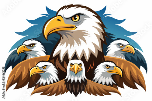 Five Bald Eagles Heads With Blue and Brown Feathers