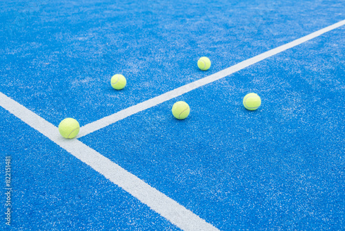 five balls on a blue paddle tennis court