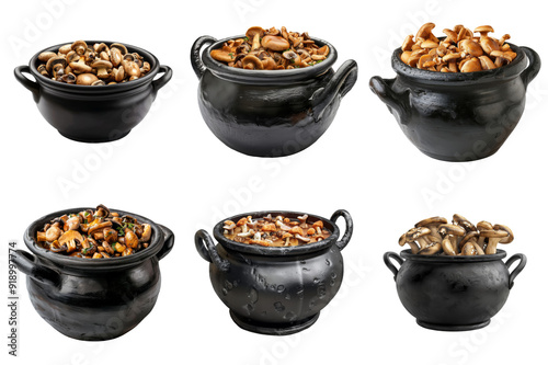 halloween, thanksgiving, autumn, fall, realistic, real, pot, black, ceramic, brown, mushroom, edible, food, cooking, ingredient, organic, natural, fresh, harvest, forest, chanterelle, oyster, white, buttons, cap, stem, stalk, gill, earthy, savoury, delicious, cookery, receipe, epicure, healthy, alimentary, vegetarian, vegan, fungal, mycology, background, isolated, studio, photo