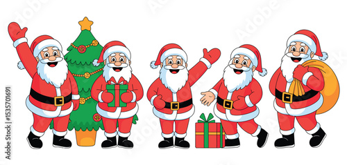 santa, christmas, cartoon, illustration, vector, graphic, design, holiday, winter, celebration, festive, merry, happy, gift, present, present, christmas tree, beard, smiling