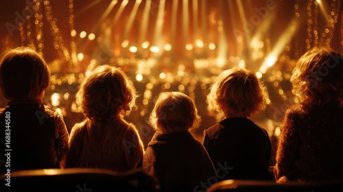 Five children with curly hair watch a brightly lit stage show, surrounded by warm golden lights and a festive atmosphere