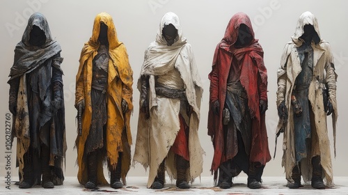 Five cloaked figures in tattered robes, showcasing diverse colors.