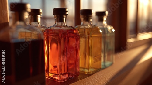 Five colorful bottles on a windowsill, illuminated by warm, golden sunlight