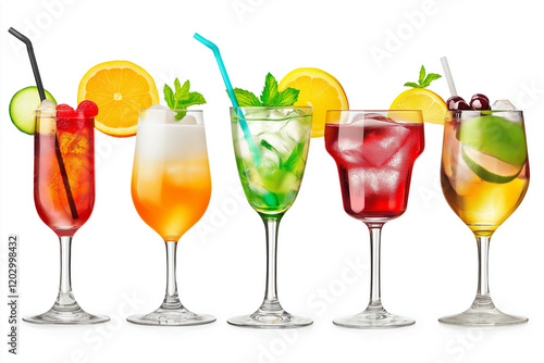 cocktail, drink, alcohol, beverage, fruit, ice, mint, colourful, white, background, isolated, refreshment, party, celebration, bar, summer, cold, glasses, orange, lime, lemon, cherry, raspberry, cucumber, juice, sweet, tasty, freshness, menu, eatery, aperitif, happy, hours, variety, assortment, vibrant