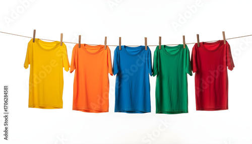t-shirt, clothes line, studio, horizontal, white, background, yellow, orange, blue, green, red, colourful, solid, clothing, fabric, short, sleeve, wooden, clothespin, brown, line, hanging, washed, wrinkled, clean, minimalist, bright, even, lighting, soft, shadow, texture, arrangement, row, garment, simple, composition, vibrant, suspended, detail, casual attire, apparel, symmetry, clothes, fashion, hanger, shop, shirt