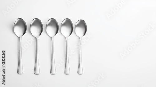 Five elegant silver spoons arranged in a line on a light background, showcasing their polished surface and intricate handle designs.
