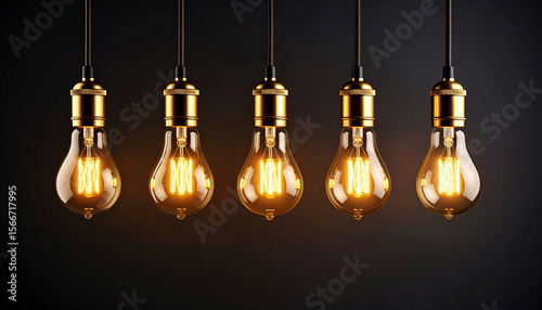 Five glowing gold retro light bulbs hanging in row against dark background, creating warm and vintage atmosphere with clean space around them