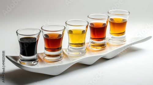 Five shot glasses featuring various vibrant drinks are elegantly arranged on a stylish white tray in a contemporary space