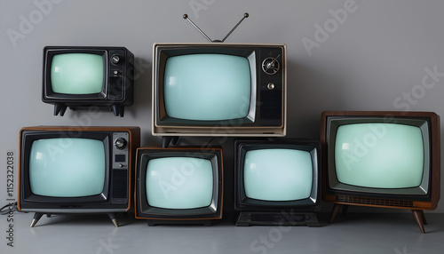 Five vintage televisions with cut out screens isolated, 8k, with white tones