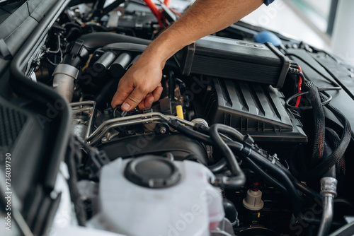 man, male, repair, car, service, station, mechanic, work, job, fixing, hood, opened, close, up, particle, detailed, view, strong, hand, arm, automobile, shop, modern, occupation, workshop, guy, blue, uniform, colours, vehicle, transport, skill, professional, wear, glove, clean, clear, surface, staff, employee, 1, person, human, indoor, technology, quality, material, adult