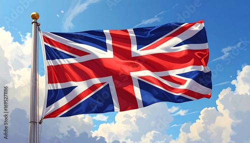 flag, britain, union, jack, british, national, waving, sky, cloud, proud, symbol, colours, red, blue, white, pole, design, nationalism, country, proudly, illustration, graphic, digital, beautiful, patriotic, symbolism, pride, texture, motion