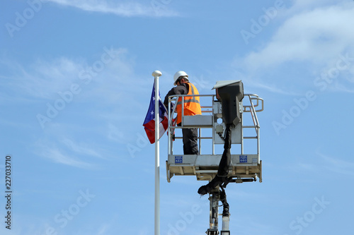flag, hoist, flag pole, flag, man, person, man, working man, artificer, hydraulic lift, platform, work tool, height, high, workwear, hard hat, helmet, security, protection, heaven