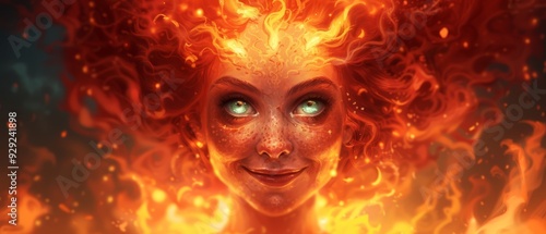 flames encircling her tresses, fiery glow encompassing visage, eyes aglow with inferno's radiance