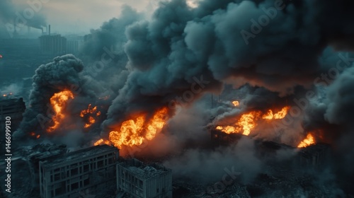 fire, smoke, destruction, city landscape, disaster, flames, abandoned, building, urban, setting, chaos, stormy, sky, emergency, rescue, aftermath, devastation, landscape, environmental, impact, danger, night time, dark, cloud, industrial, area, heat, ash, ruin, magnitude, loss, response, crisis, toxicity, decay, dramatic, peril, fiery, aerial, view