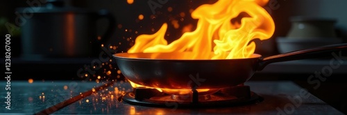 Flames engulfing a metal frying pan on stovetop surface, danger, sparks