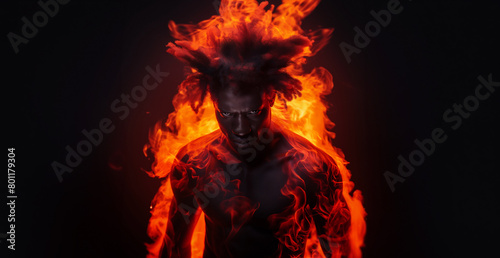 Flaming handsome tough African american man of color set against a black background. Supernatural man on fire. Walking trough the fire. Also related to: Unyielding, Assertive, Unassailable