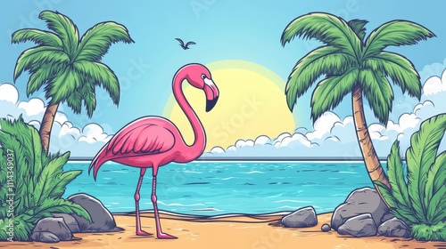 flamingo, bird, nature, summer, exotic, tropics, animal, beak, wild, beach, sky, white, love, head, walk, paradise, aruba, leaf, sand, water, 1, colourful, wildlife, africa, leg, illustration, zoo, decoration, plant, palm, standing, travel, plumage, horizontal, sea, cute, caribbean, vector, card, environment, holiday, neck, symbol, beauty, coast, design, feather, background