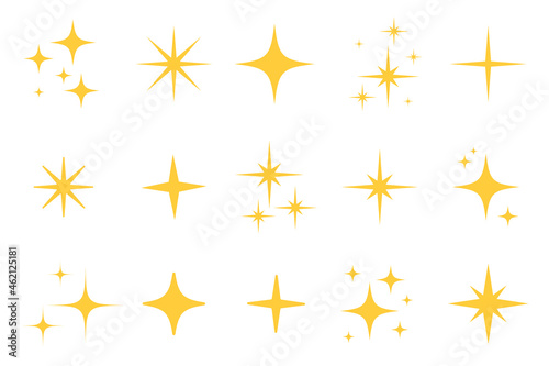Flash sparkle flat star icon set. Twinkle star silhouette for gold sparkle, yellow glitter light, magic shiny flare effect. Isolated vector illustration.