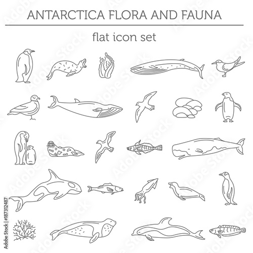 Flat Antarctica flora and fauna elements. Animals, birds and sea life simple line icon set
