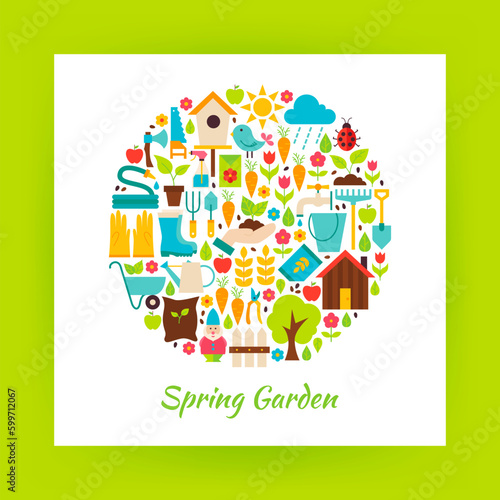 Flat Circle Spring Garden Objects. Collection of Vector Gardening Tools isolated over white Paper Template.