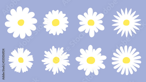 Flat daisy set. Chamomile meadow white flowers icons. Daisies floral collection with various petals. Retro groovy trendy isolated vector botanical clipart