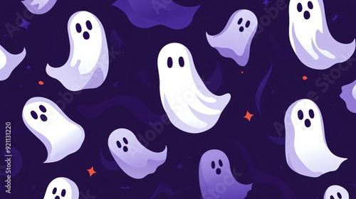 Flat design Halloween background featuring simple ghost illustrations floating against a dark purple backdrop