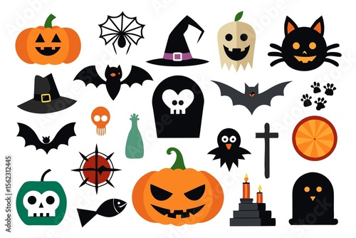 Flat Design Halloween Icons: Spooky Pumpkins, Bats, Ghosts, and More.