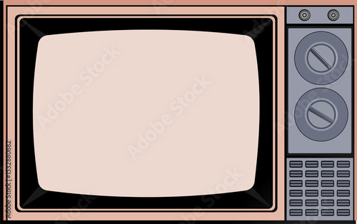 Flat design TV set is sitting on transparent background, showing pastel pink bezel and tuning knobs