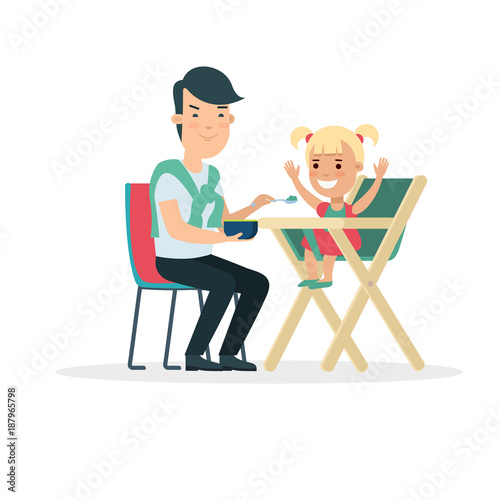 vector, flat, style, design, creative, collection, web, site, template, illustration, website, children, children, children, people, man, girl, male, young, infographic, family, eltern, parenting, time, father, daughter, baby, indoor, hand, smile, character, isolated, white, background, eat, nourish, dinner, breakfast, healthy, little, chit, feeding, eat, sitting, high, chair, home, furniture, father