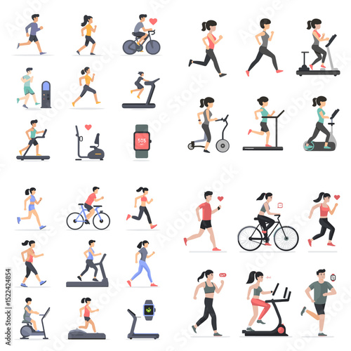Flat fitness and cardio exercise vector showing people running, cycling, and using gym equipment—great for health apps, workout plans, and fitness campaigns.