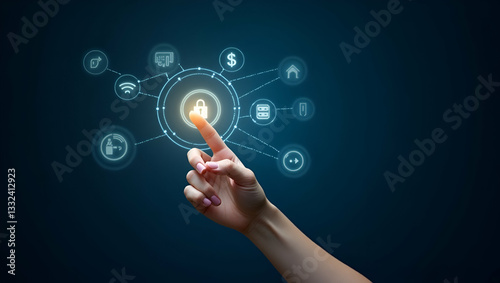 Flat Hand Engaging with Holographic Digital Banking Interface: Secure Financial Services & Currency Exchange Icons