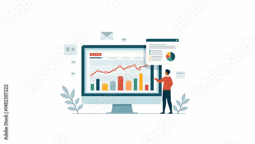 Flat High quality photo stock image featuring advanced digital advertising insights interface with dynamic interactive dashboards and comprehensive digital analytics for strategic online marketing eva