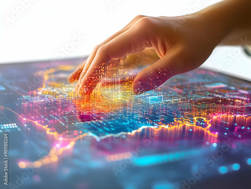 Flat Holographic Electoral Map Concept: Close-Up of Voter's Hand Interacting With 3D Holographic Election Results, Showcasing Advanced Data Visualization in a Simple Flat Vector Illustration