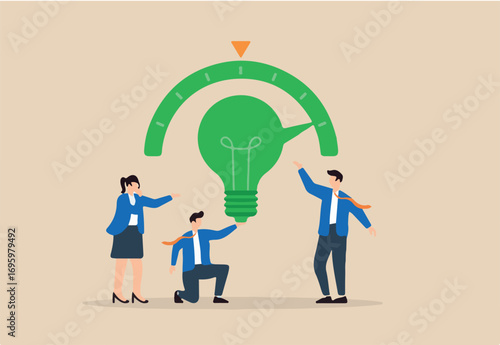Flat illustration of employees rotating green lightbulb dial to set company direction towards renewable future