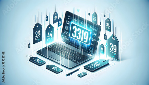 Flat Laptop with Holographic Price Tags concept as Horizontal shot of a laptop on a white background with glowing holographic price tags surrounding it creating a modern Black Friday copy space perfec