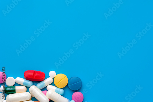 Flat lay - multicolored pills, drugs and capsules on blue background