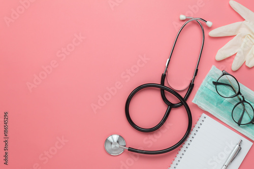 Flat lay aerial of accessories healthcare & medical background concept.Free space for mock up & template.Difference objects on modern rustic pink paper.An idea for essential tools doctor in hospital.
