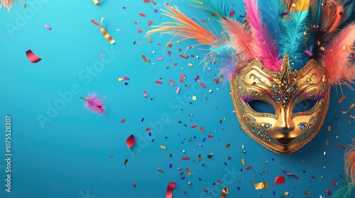 carnival, mask, gold, arrangement, colourful, feather, confetti, blue, background, copy space, party, celebration, decoration, festive, fun, artistic, design, vibrant, creative, luxury, event, theatrical, culture, tradition, masquerade, glamour, ornate, shiny, joy, playful, visual, texture, detail, design element, accessory, whimsy, cheerful, decorative, surprise, exotic, bright, stylish, entertainment