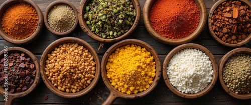 flat lay background cover banner image of various spices in wooden bowls on a wooden table with copy space